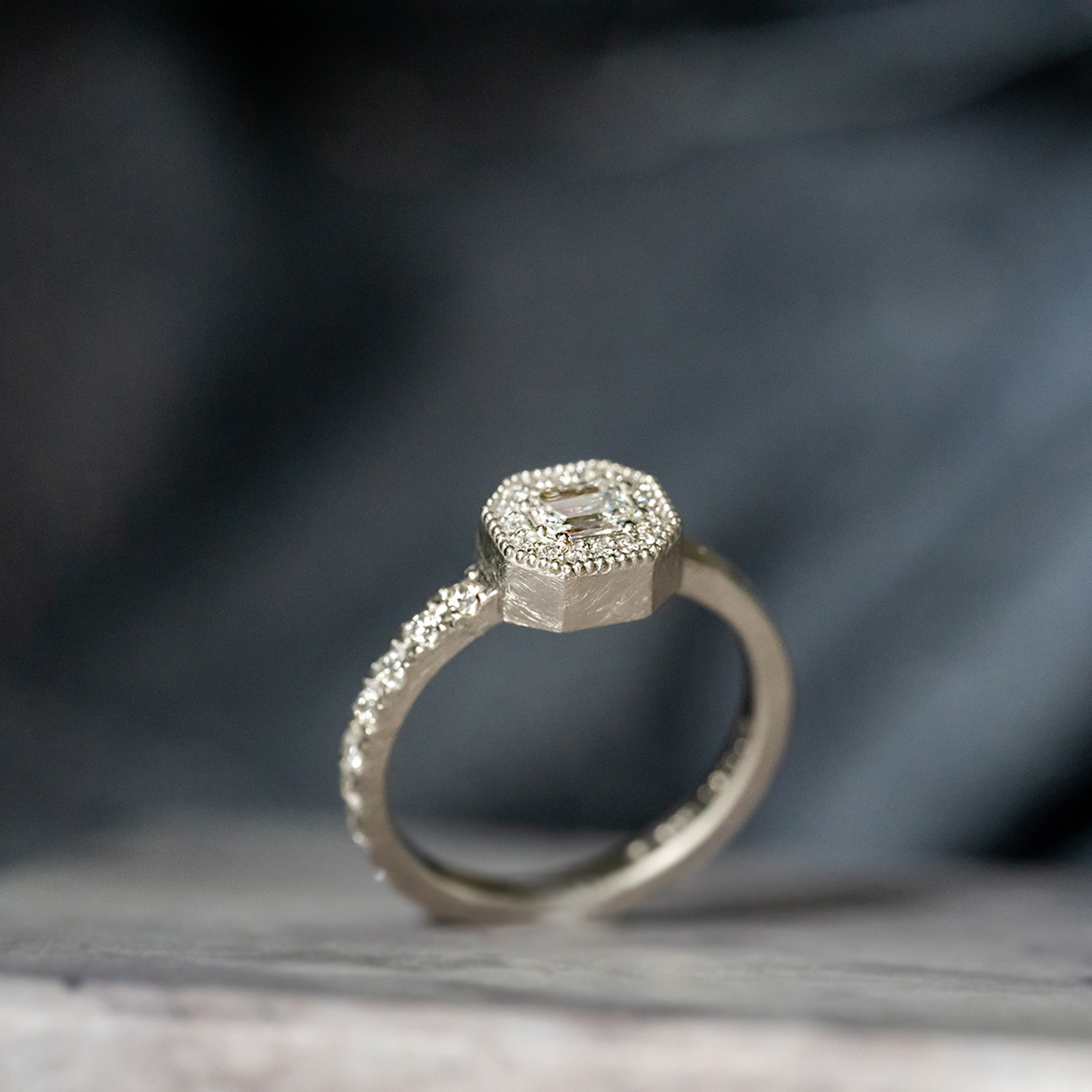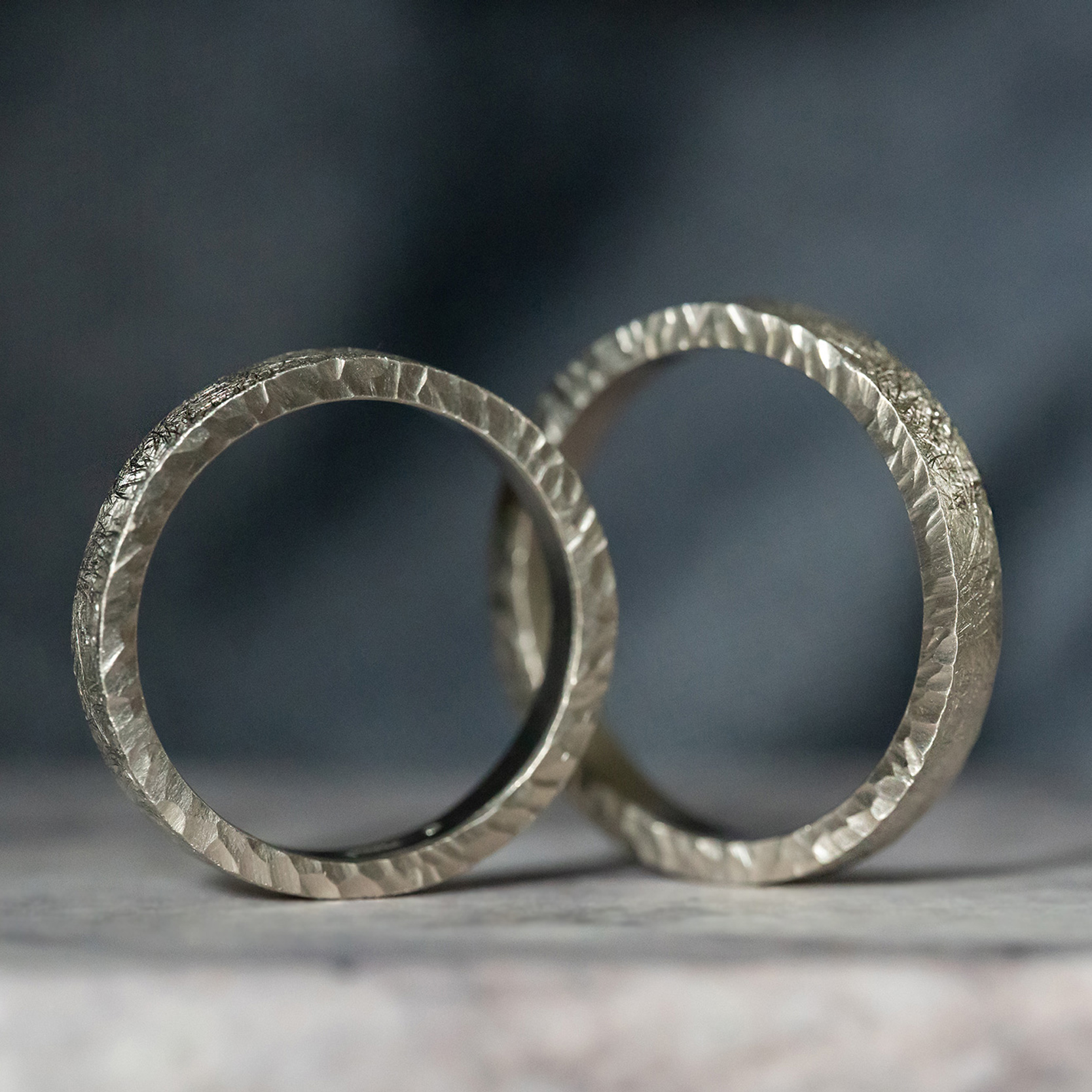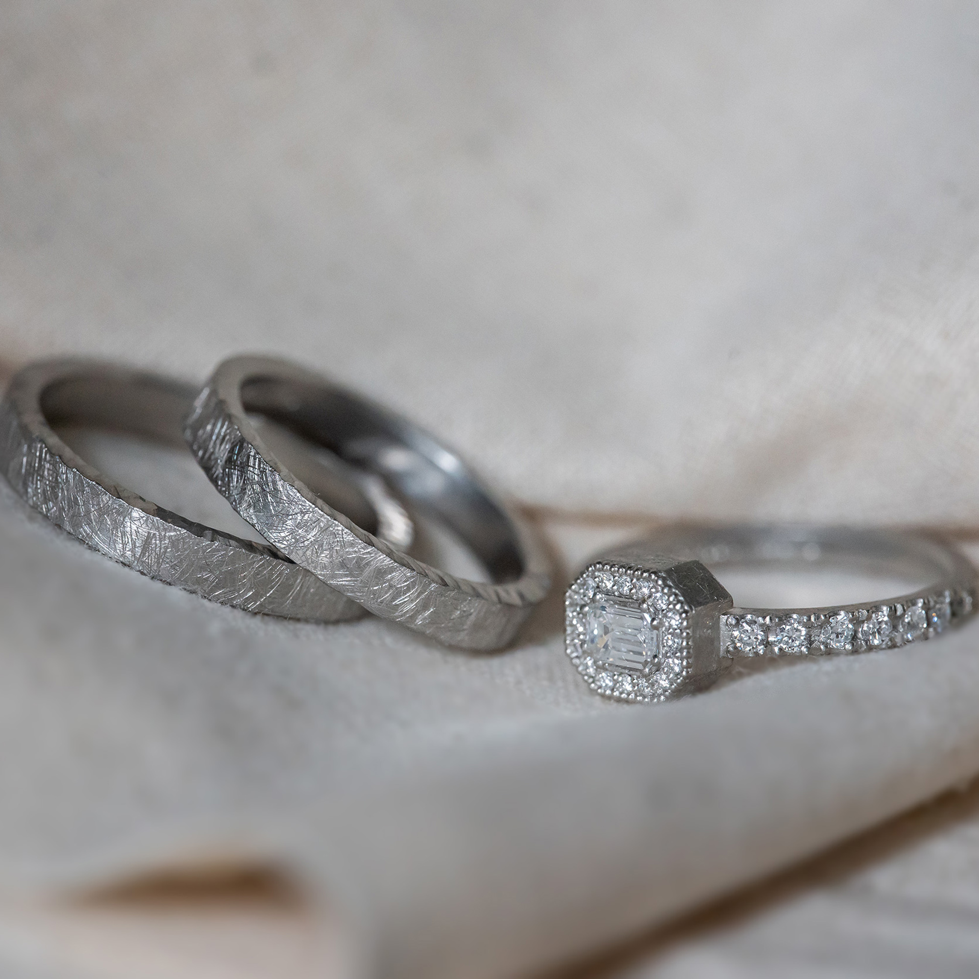 ご結婚指輪は槌目加工を施し手作業の温もりを感じるデザイン。ご婚約指輪はサイズの違うダイヤモンドとミルグレインの装飾で華やかな印象に。