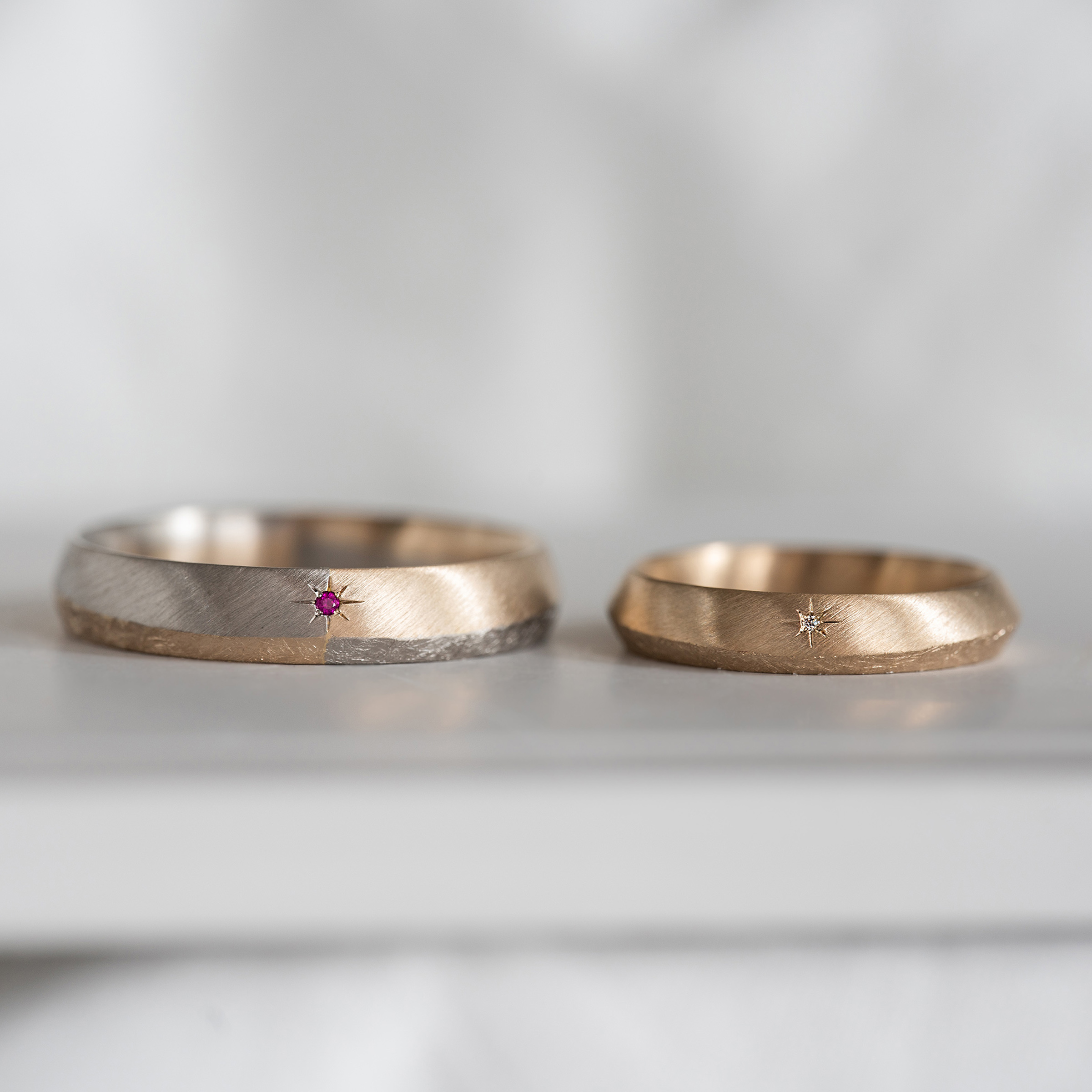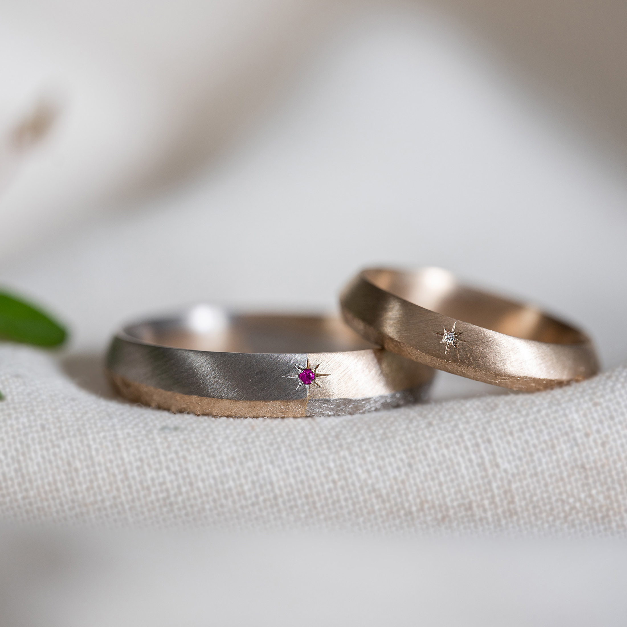 メンズは2色素材を使い、星留めしたルビーの色味が美しく映えます。レディースはダイヤモンドで上品な印象に。