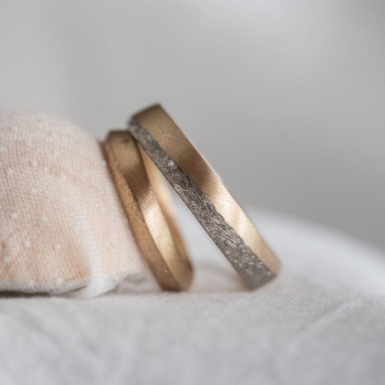 剣腕のように山型の断面を作り表面のテクスチャーを分けてお作りしたフルオーダーメイドの結婚指輪。