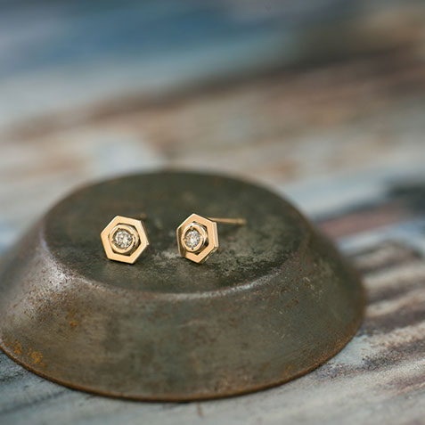 幾何学的な模様をモチーフにしたジュエリーはシンプルで、