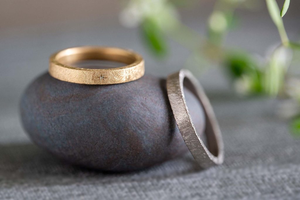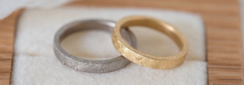 温かみのあるアンティーク感 2022.2.2 カテゴリー: 結婚指輪 宝石: ダイヤモンド 地金: K18イエローゴールドK18グレイッシュゴールド 平打ちのスタイリッシュなご結婚指輪 エッジを効かせたシャープなフォルムに レディースは星彫りの加工を加えました 幅をしっかりもたせたリングに ダイヤモンドマットを施し アンティークな風合いで温かみのある印象に お二人のお手元で明るく華やかに輝きます ダイヤモンドマット加工は特殊なダイヤモンドの工具で 細かくキズをつけることできらきらと優しい輝きを放ちます。 シンプルに、そして素材そのものの 美しさを活かした デザインに仕上がりました。
