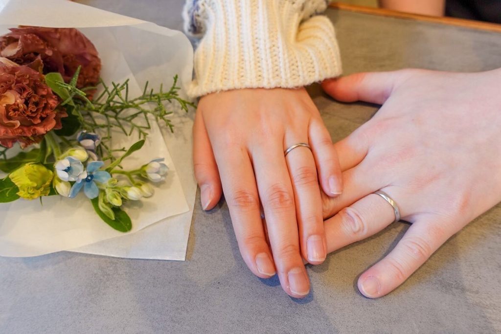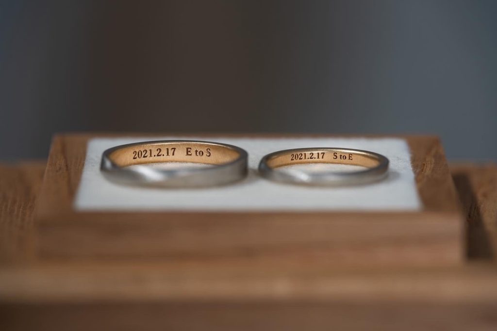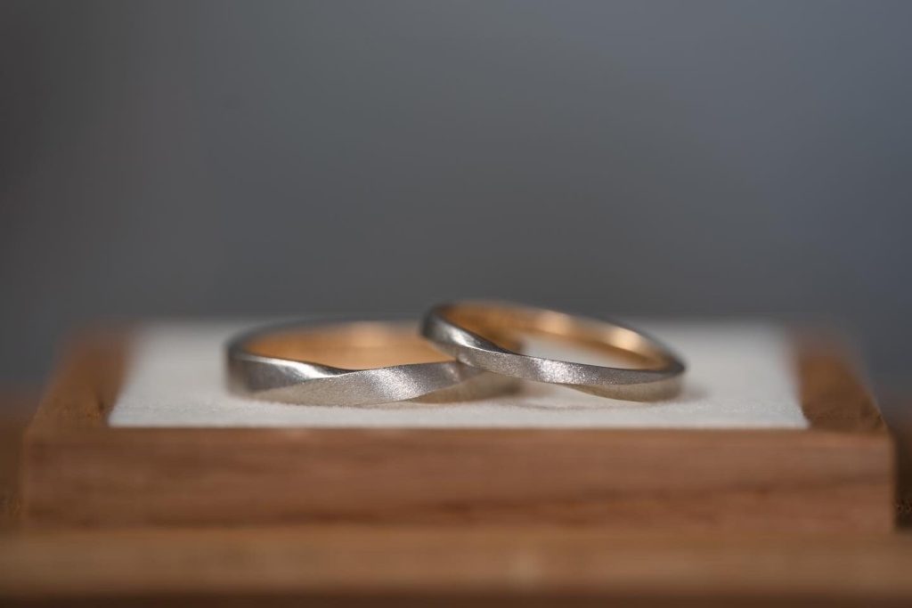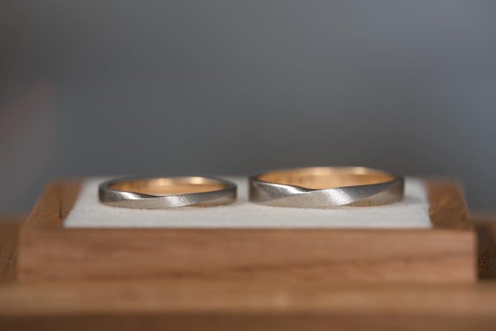 スタイリッシュなカーブ 2022.11.3 カテゴリー: 結婚指輪 地金: プラチナ950K18イエローゴールド コレクション: フリージア 【フリージア】を幅細にアレンジ。より繊細なデザインに仕上がりました。メンズは平打ちでスタイリッシュな印象に。レディースは指に触れる内側を滑らかに丸みを持たせて仕上げました。 —————————————————Men’s素材:プラチナ950、K18イエローゴールドテクスチャー:ハードマット、ブラシマット幅:2.8mm Ladies’素材:プラチナ950、K18イエローゴールドテクスチャー:ハードマット、ブラシマット幅:2.0mm—————————————————